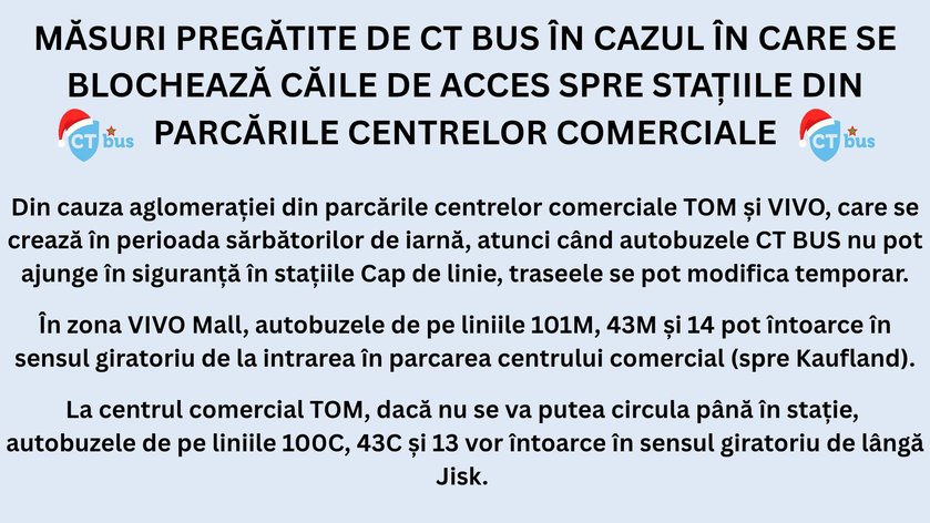 CT BUS pune la dispoziția călătorilor internet WI-FI gratuit în toate mijloacele de transport. În cazul în care rețeaua nu funcționează, vă rugăm să anunțați șoferul autobuzului.